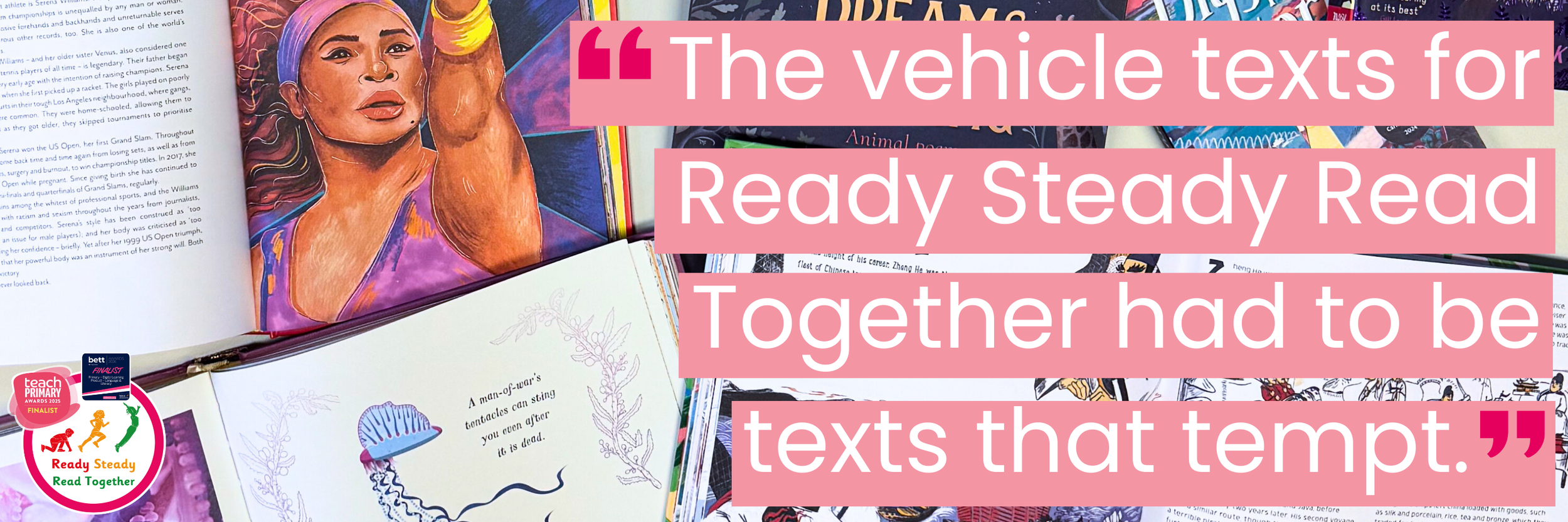 If asked what the greatest indicator of a child’s future success is, most people would think that it would be the family’s socio-economic status. In fact, reading for pleasure is the single most important indicator of a child’s future success (OECD, 2002). However, a delicate balance exists between teaching the skill of reading whilst nurturing the enjoyment of it. So, vehicle texts for Ready Steady Read Together had to be ‘texts that tempt’ (Cremin, 2024) and motivate children to want to read, furthermore the text must be visually appealing and reflect the diversity of their personal interests.