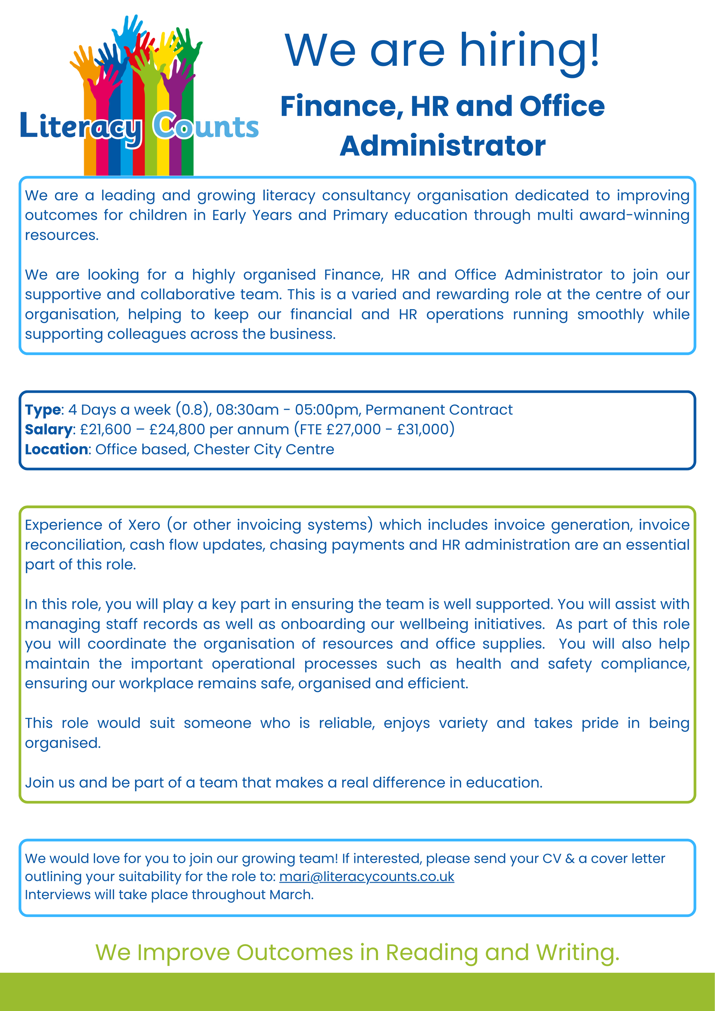 We are hiring! View fullsize Finance, HR & Office Administrator Download as a PDF We would love for you to join our growing team! Never miss a thing! Follow us on your chosen platform to keep up to date on all things Literacy. View fullsize View fullsize View fullsize View fullsize View fullsize View fullsize